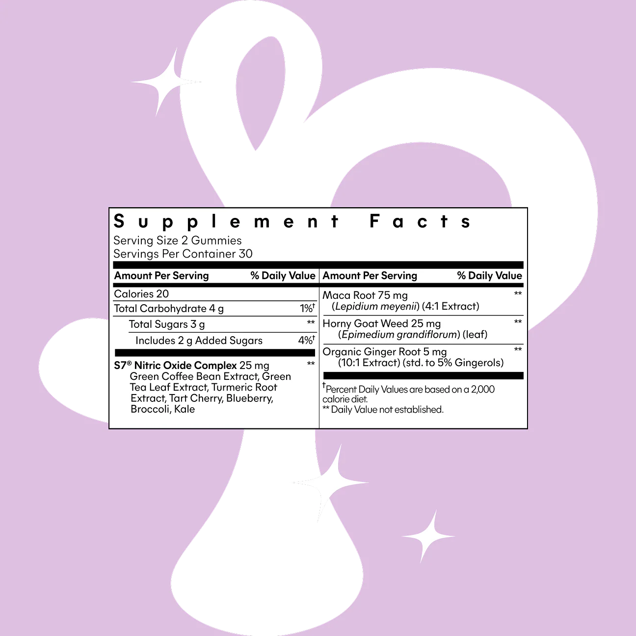 El complejo S7®, clínicamente probado, favorece los niveles de óxido nítrico y promueve una circulación sanguínea saludable, mientras que la hierba de cabra en celo y la raíz de maca intensifican el juego.*